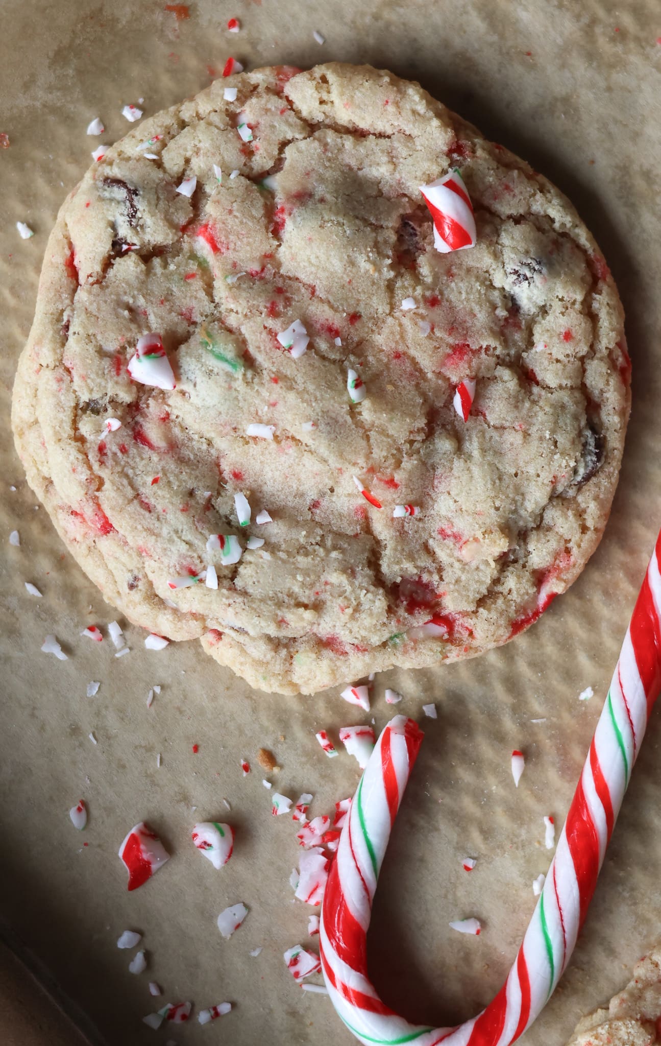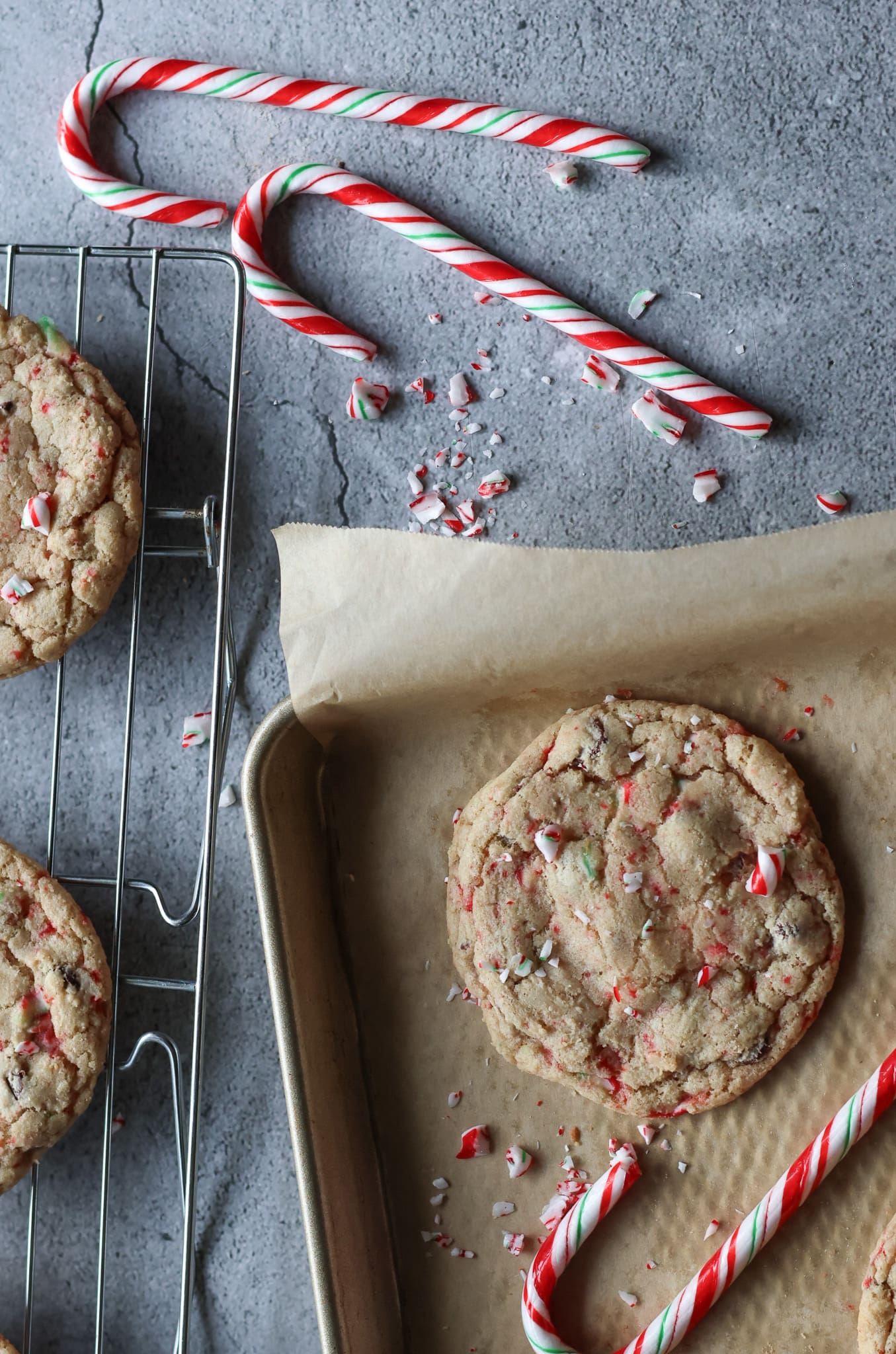 Add the dry mixture to the wet and mix until combined. Next add in the chocolate chips and beat until just mixed. Lastly, add in the crushed candy cane and mix until incorporated.